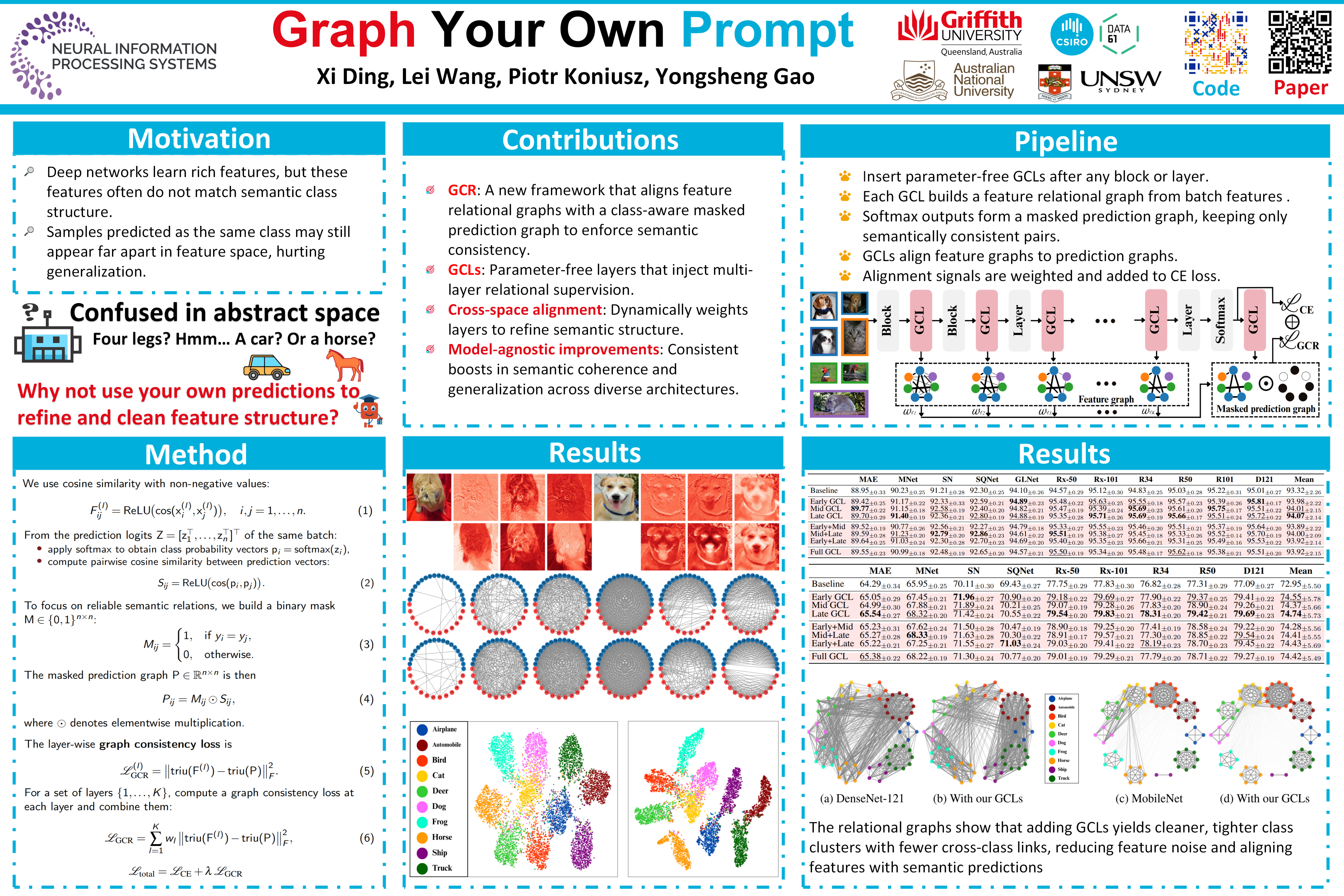 | Graph Your Own Prompt X Ding*, L Wang*, P Koniusz, Y Gao Advances in Neural Information Processing Systems (NeurIPS) | [A*] Code, Project website, Slides, Poster | 2025 |