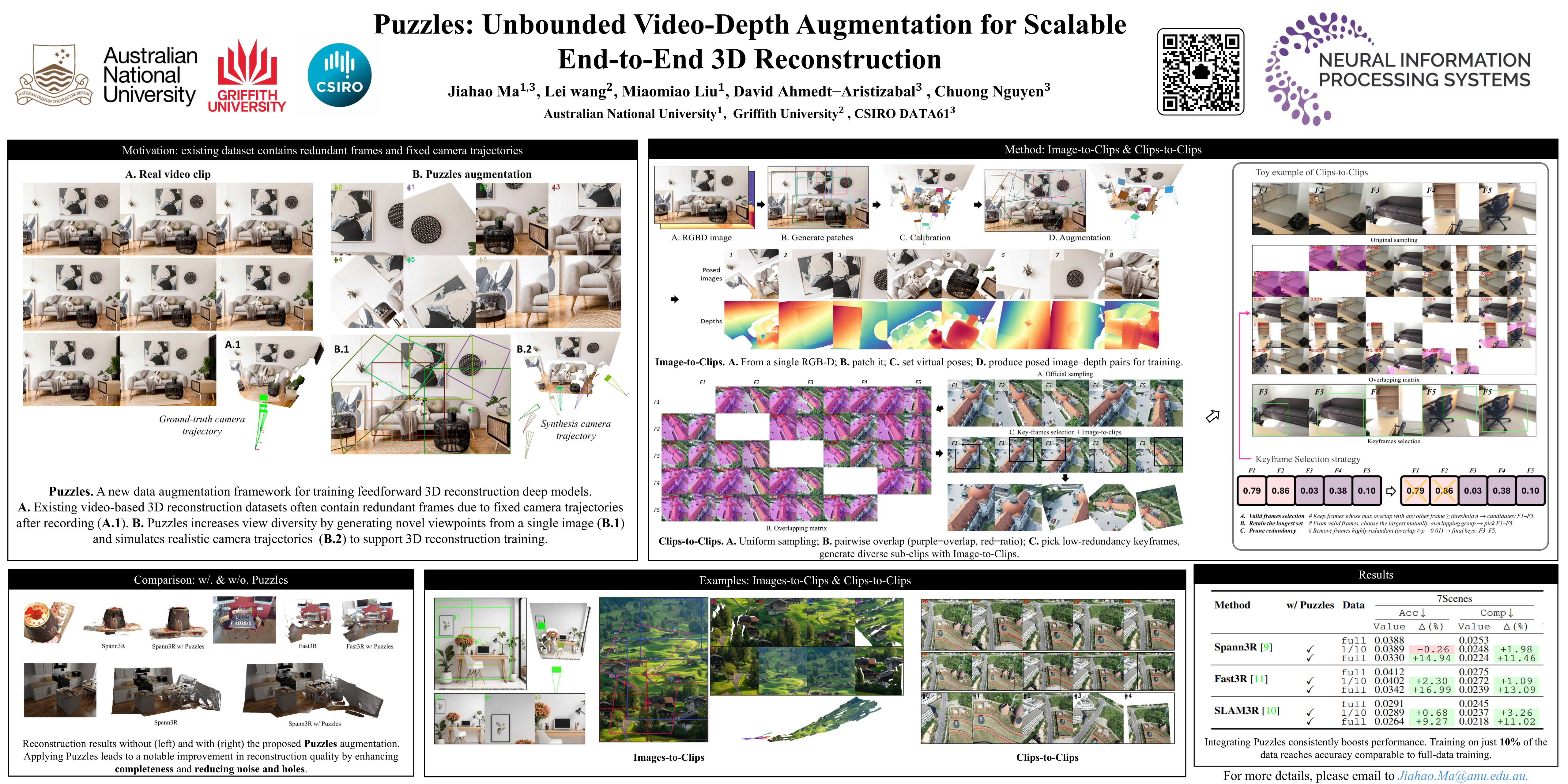 | Puzzles: Unbounded Video-Depth Augmentation for Scalable End-to-End 3D Reconstruction J Ma, L Wang, M Liu, D Ahmedt-Aristizabal, C Nguyen Advances in Neural Information Processing Systems (NeurIPS) | [A*] Code, Project website, Slides, Poster | 2025 |